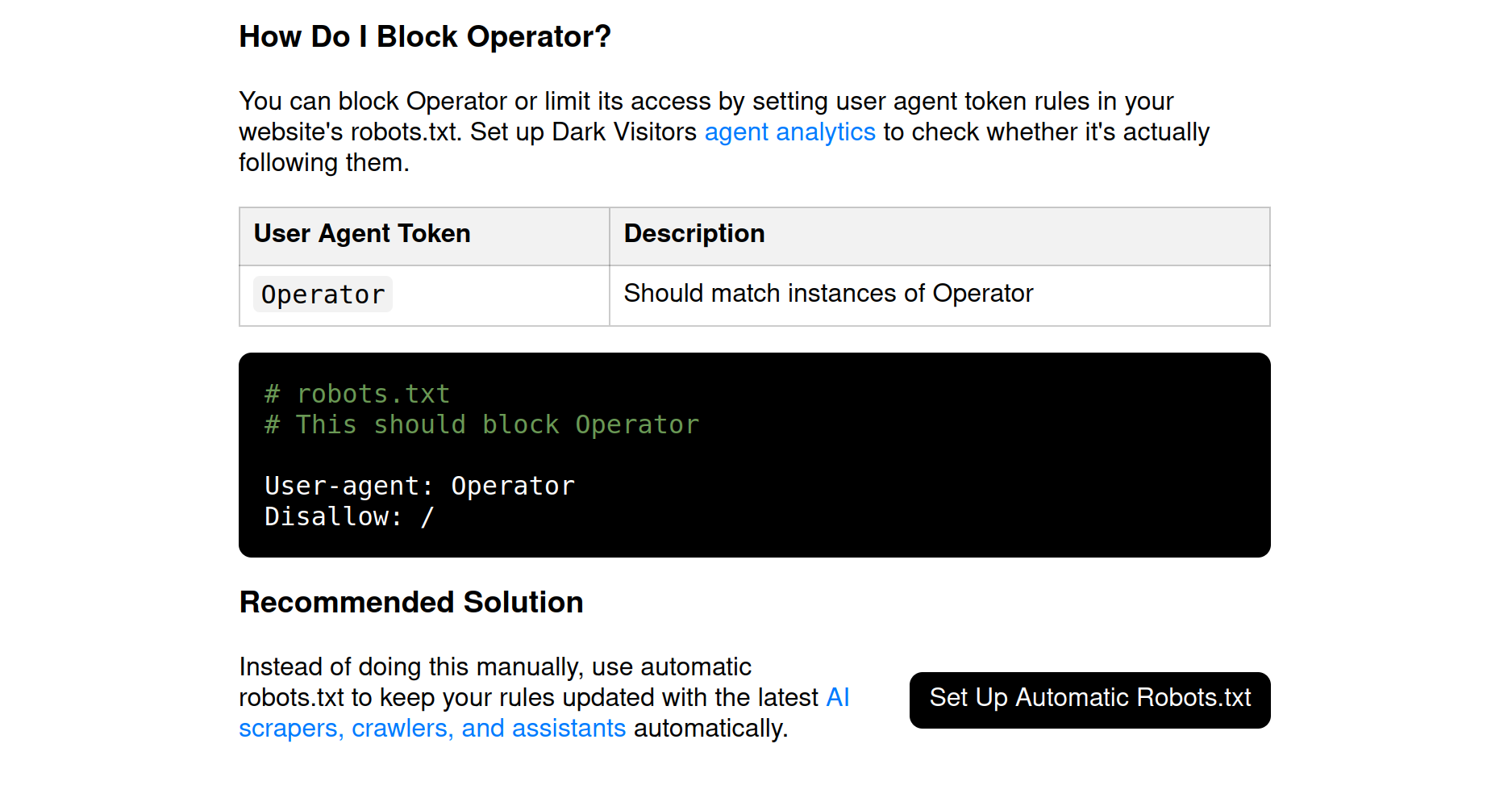 A popular, appearing-on-multiple-media service called Dark Visitors specifically claims that they can "Track the AI agents browsing your website", prominently featuring Operator: